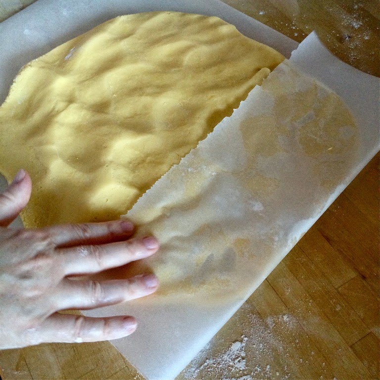 Riprendere la pasta frolla raffreddata, lavorarla brevemente sul piano infarinato e tirarla da circa 3mm fino a 5 mm.